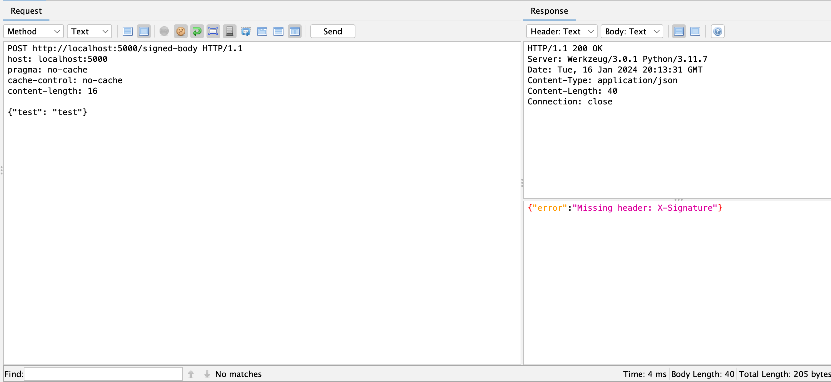The screenshot below illustrates an attempt to send a request that did not include additional headers. As you can see, the server indicated their absence and did not process the message.